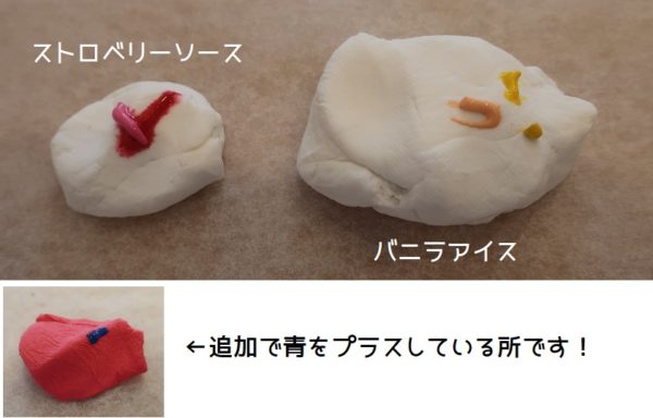 粘土の色が出来上がりを左右すると言っても過言ではありません。バニラだから白でいいや~ではなく、バニラってちょっと黄色がかっているよね?と細かい色に目を向けることがリアルに作るコツです。