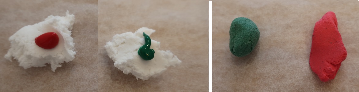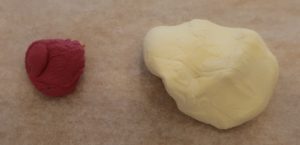 濃いビビットな色味の場合は、絵の具の量を多めに入れていきます。絵の具が多いと捏ねる時に絵の具が飛び出して大変ですが、捏ね続けていると馴染んできますので頑張ります。