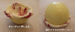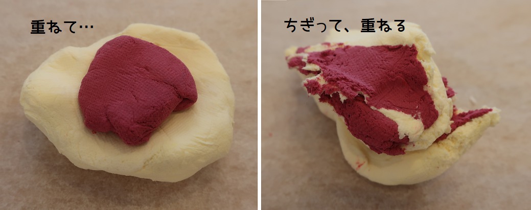 絵の具で粘土に色づけたら、マーブル模様を作っていきます。ストロベリーソースをバニラアイスに混ぜていく工程ですね。