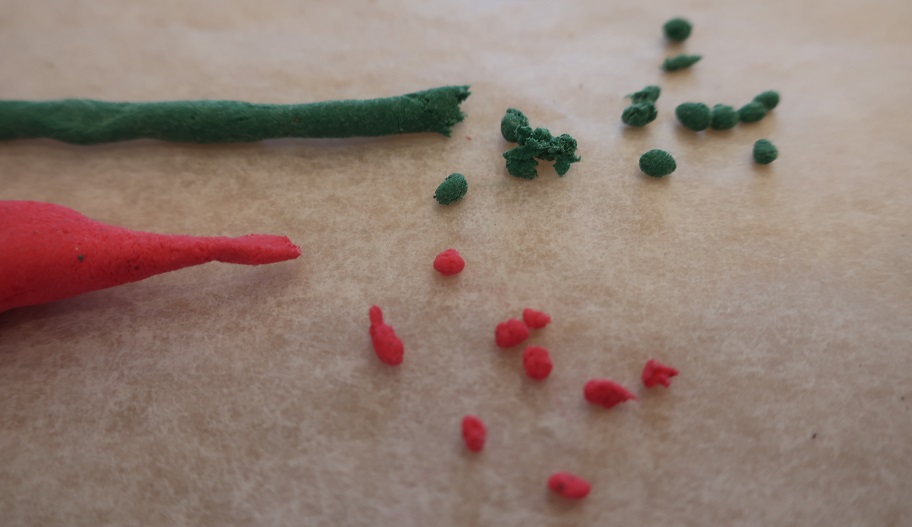 色粘土を作る時は、薄い色→濃い色で作っていくと良いです。手袋に絵の具が残っていた場合、色が混ざってしまうんですよね。都度手袋を変えるでも良いのですが、薄い色から作っていくことで、交換回数は減るかと思います。