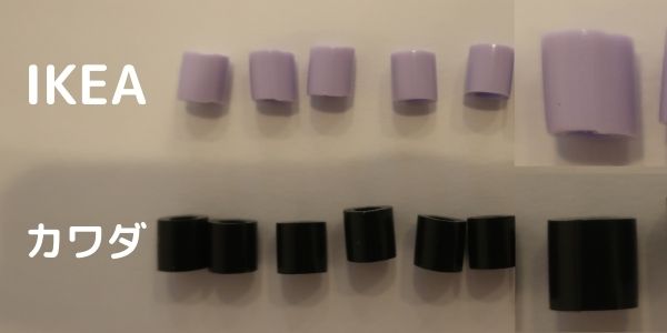 IKEAはひとつひとつのビーズが小さいのでお互いのビーズがくっつくまでに、結構アイロンをかけて溶かさないと結合しませんでした。カワダ製のビーズは太いので、アイロンをかけ始めると隣のビーズとくっつきやすいです。